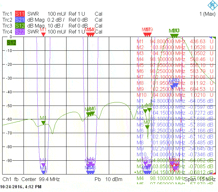 Сложно что-либо предпринять, если разнос между частотами передачи небольшой и составляет сотни килогерц. Тут приходится мириться с большими размерами используемых резонаторов. Однако, если между частотами передатчиков мы имеем 1 МГц или более,то можно смело применять резонаторы меньших размеров. Наша компания предлагает строить мосты сложения на преселекторах из 4-х дюймовых прямоугольных резонаторов. Преселектор из трёх таких резонаторов обеспечивает весьма крутые скаты АЧХ , а применение режекторных петель связи добавляет ещё и полюса режекции.