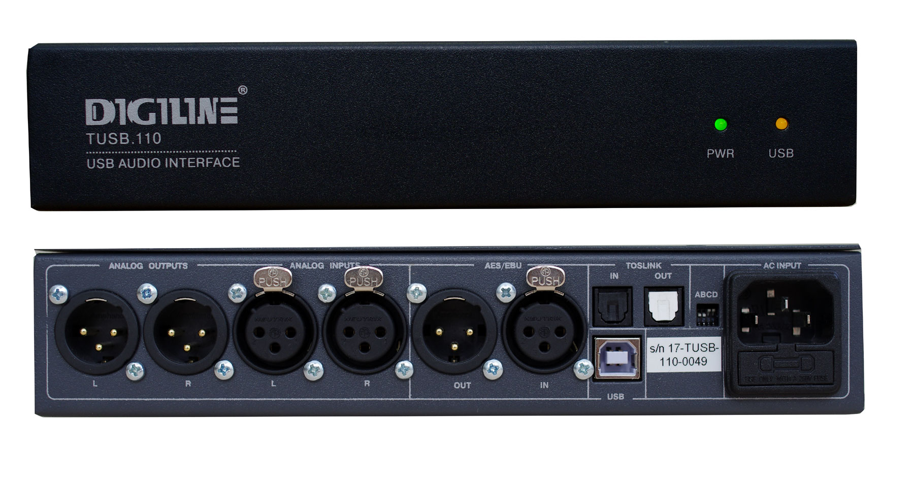 DIGILINE TUSB.110 – одноканальный внешний USB звуковой интерфейс. Предназначен для вещательных и монтажных станций комплексов автоматизированного радиовещания.