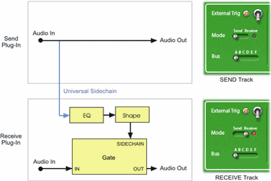 Notice that when set up like this ( External Trig is on), the "send" plug-in does not gate the audio, but passes audio unprocessed directly to its output. Only the "receive" plug-in acts as a gate. For full details please see the User Manual .