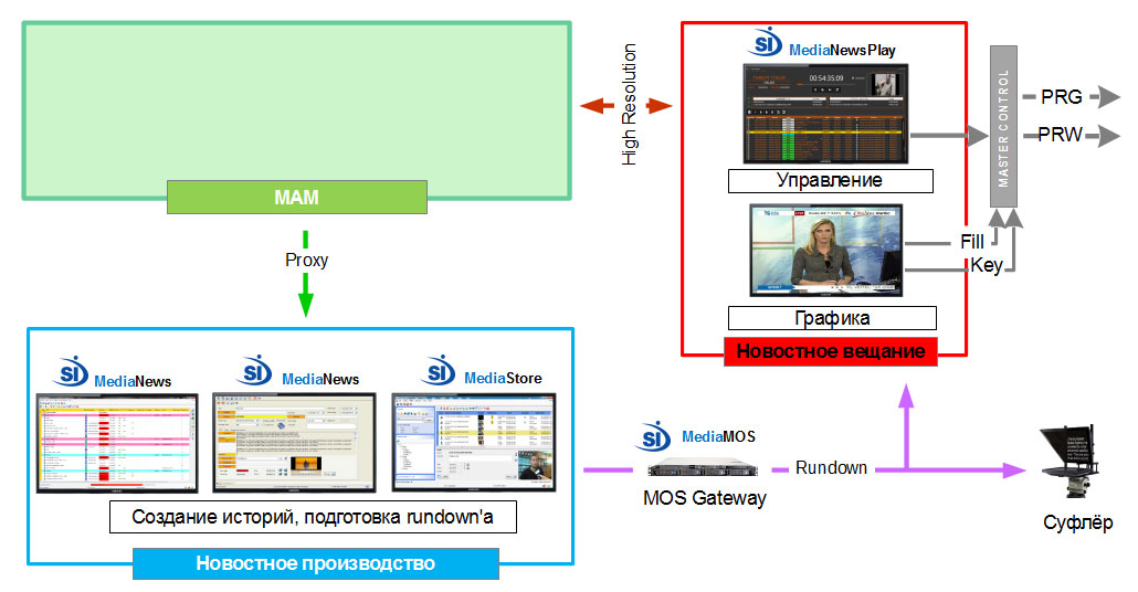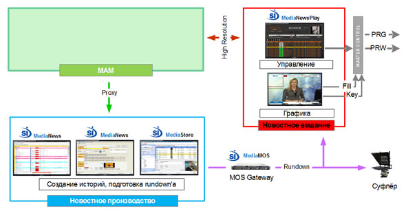 Весь контент, с которым работают журналисты, располагается в системе управления контента телекомпании. Несмотря на то, что отдел производства новостей использует общий MAM телекомпании, контент журналистов отделён от контента телекомпании, и доступ к нему возможен только в новостном производстве. Для срочного добавления контента у журналистов есть возможность загрузить его в производство непосредственно со своих рабочих мест. Журналисты работают с копиями «низкого» разрешения (proxy-копиями) контента. При необходимости в выполнении сложного монтажа, новостные сюжеты отправляются в отдел нелинейного монтажа.