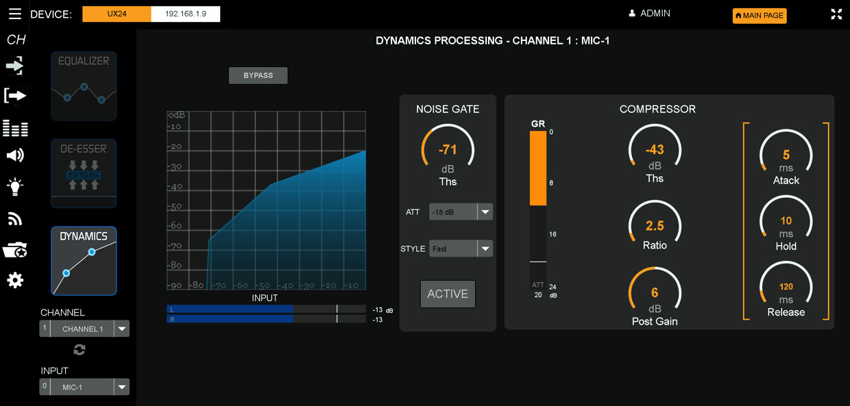 При настройке микрофонов вы найдете полноценный channel strip, с регулировкой усиления прямо в параметрах канала. Есть три прекрасно работающих эффекта - де-эссер, эквалайзер и компрессор, совмещенный с гейтом. Разработчики не стали урезать функциональные возможности и параметры этих обработок. В де-эссере настраиваются верхняя и нижняя частоты полосы подавления, в эквалайзере присутствуют четыре полностью параметрических полосы с вариантом выбора типа верхнего и нижнего фильтра (полка, обрезка, пиковый). В компрессоре есть регулировка порога, атаки, восстановления и даже удержания (hold), плюс регулируемый вручную (не автоматически) параметр выходного усиления. Каждый эффект можно выключить кнопкой бай-пасс. Так что на борту уже есть приличный предусилитель, и вам не потребуется тратиться на внешнюю обработку.