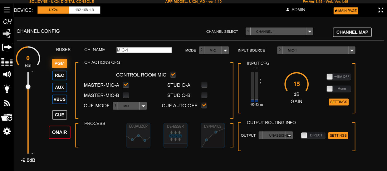 Пандемия коронавируса показала, насколько важно иметь полноценное удаленное управление оборудованием в аппаратно-студийном комплексе. DIGILINE BMC.124 имеет встроенный web-сервер для удаленного доступа. Подключившись к нему с любого устройства, поддерживающего HTML 5.0, можно комфортно управлять консолью через 24-фейдерный виртуальный микшер. Интерфейс адаптирован для мониторов с тачскрином. Управление DIGILINE BMC.124 может осуществляться с нескольких устройств одновременно. Помимо этого, полностью доступны все настройки консоли, а также главный экран мастер-секции с индикаторами уровня и часами. Web-интерфейс максимально приближен к интерфейсу встроенного в консоль дисплея — не приходится искать ассоциации настроек пульта на компьютере.